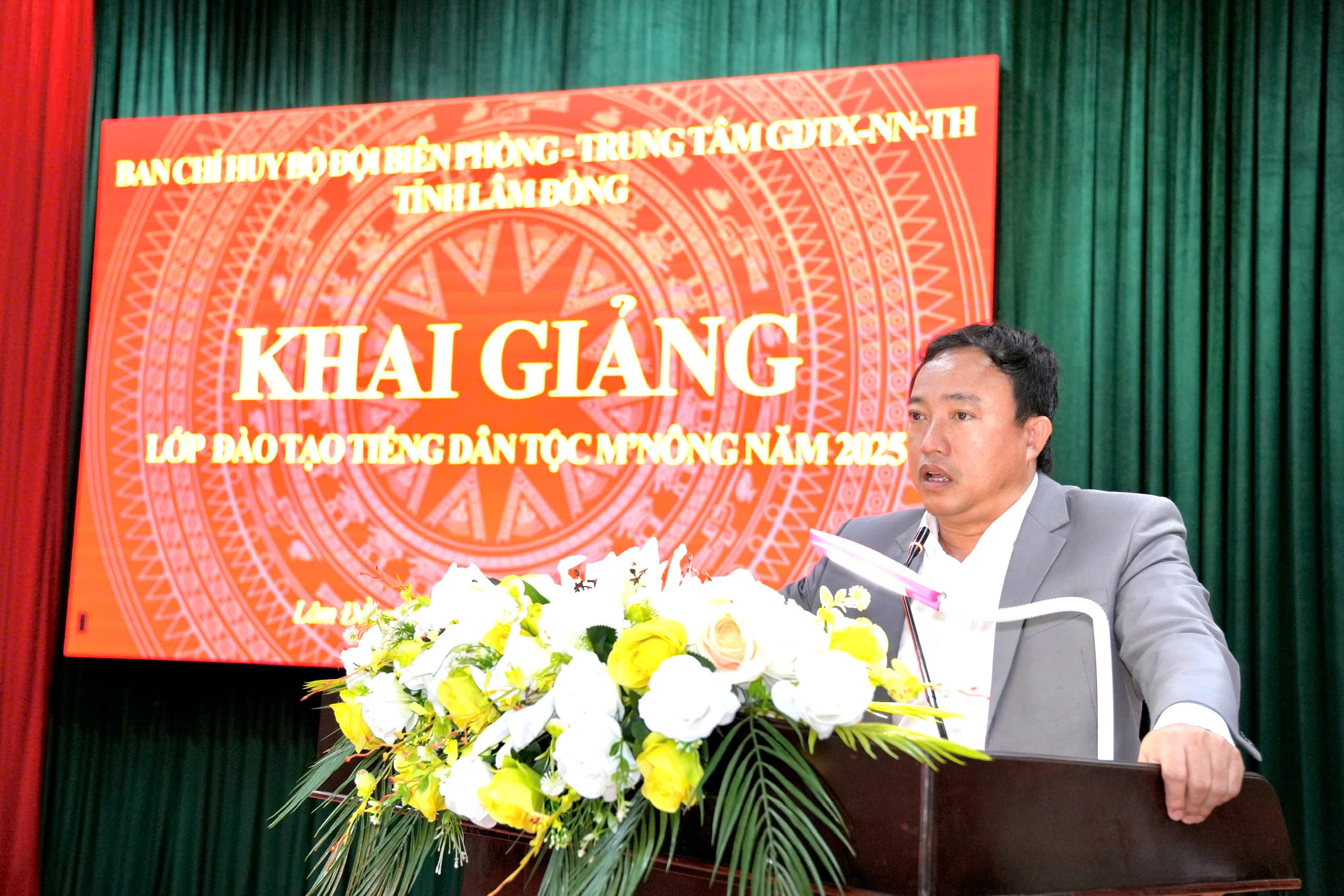 Vào lúc 08 giờ 00 phút, ngày 25 tháng 10 năm 2025, Trung tâm GDTX – Ngoại ngữ, tin học tỉnh Lâm Đồng tổ chức khai giảng lớp bồi dưỡng tiếng M’nông cho cán bộ, chiến sĩ ban chỉ huy Biên phòng tỉnh Lâm Đồng Về phía lãnh đạo bộ chỉ huy biên phòng tỉnh Lâm Đồng có Đại tá Phạm Huy Thành phó chỉ huy trưởng Về phía lãnh đạo Trung tâm có Thạc sĩ Lê Đức Ánh, giám đốc trung tâm Buổi khai giảng diễn ra ngắn gọn nhưng đầy đủ nội dung, chương trình. Lớp học sẽ kết thúc vào tháng 12 năm 2025. Lớp học này sẽ trang bị cơ bản 4 kỹ năng nghe, nói, đọc, viết. Giúp cho CB chiến sĩ hiểu nhiều hơn văn hoá của người đồng bào M’nông.