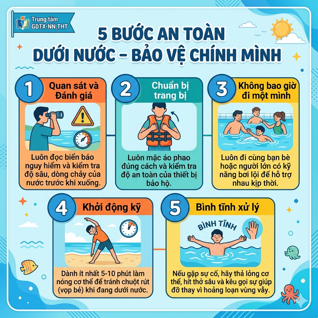 “Đuối nước không chừa một ai, nhưng chúng ta hoàn toàn có thể phòng tránh bằng sự chuẩn bị kỹ lưỡng. Việc rèn luyện kỹ năng bơi lội, hiểu biết về dòng chảy và nắm vững cách sơ cứu không chỉ là học một kỹ năng sống, mà là trang bị ‘lá chắn’ cho mạng sống chính mình. Thay vì chủ quan, học viên Trung tâm GDTX-NN, THT tỉnh hãy chọn cách luyện tập để đổi lấy sự tự tin và an tâm bền vững. Hãy đặt an toàn lên hàng đầu để mỗi hành trình với sóng nước luôn là những kỷ niệm trọn vẹn và hạnh phúc.”